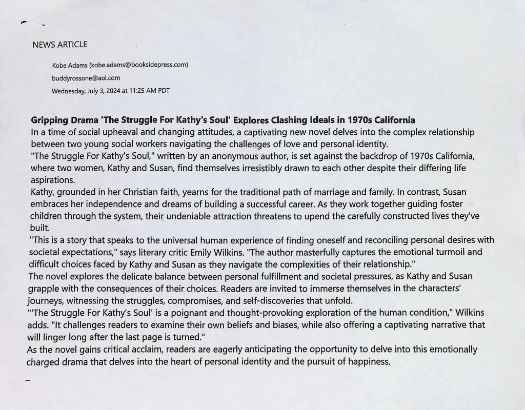 “The Struggle For Kathy’s Soul,” written by an anonymous author, is set against the backdrop of 1970s California, where two women, Kathy and Susan, find themselves irresistibly drawn to each other despite their differing life aspirations.
